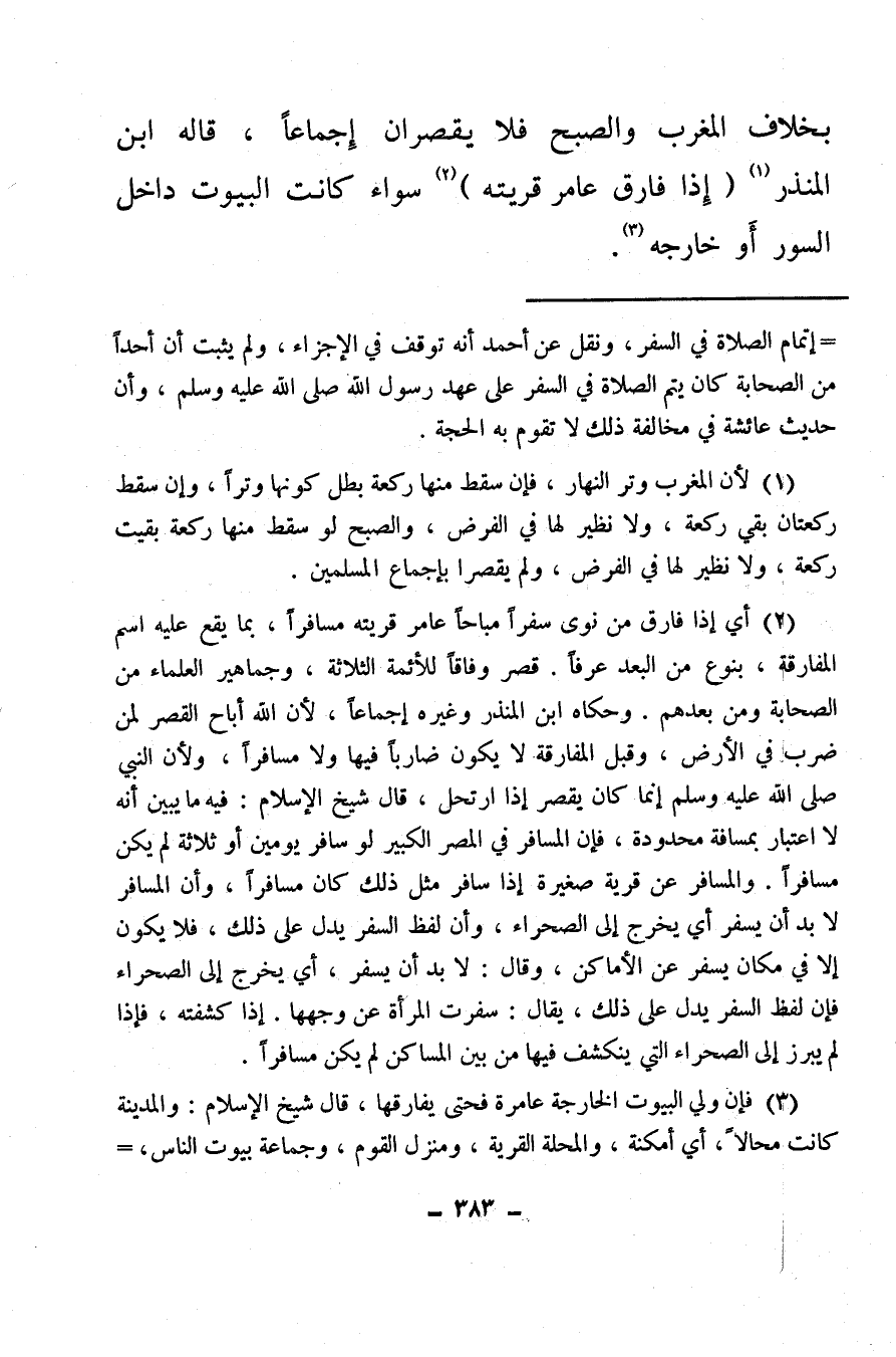 (¬2) أي إذا فارق من نوى سفرا مباحا عامر قريته مسافرا، بما يقع عليه اسم المفارقة، بنوع من البعد عرفا، قصر وفاقا للأئمة الثلاثة، وجماهير العلماء من الصحابة ومن بعدهم، وحكاه ابن المنذر وغيره إجماعا لأن الله أباح القصر لمن ضرب في الأرض، وقبل المفارقة لا يكون ضاربا فيها ولا مسافرا، ولأن النبي صلى الله عليه وسلم إنما كان يقصر إذا ارتحل قال شيخ الإسلام: فيه ما يبين أنه لا اعتبار بمسافة محدودة فإن المسافر في المصر الكبير لو سافر يومين أو ثلاثة لم يكن مسافرا والمسافر عن قرية صغيرة إذا سافر مثل ذلك كان مسافرا، وأن المسافر لا بد أن يسفر أي يخرج إلى الصحراء، وأن لفظ السفر يدل على ذلك، فلا يكون إلا في مكان يسفر عن الأماكن، وقال: لا بد أن يسفر، أي يخرج إلى الصحراء فإن لفظ السفر يدل على ذلك، يقال: سفرت المرأة عن وجهها، إذا كشفته فإذا لم يبرز إلى الصحراء التي ينكشف فيها من بين المساكن لم يكن مسافرا.