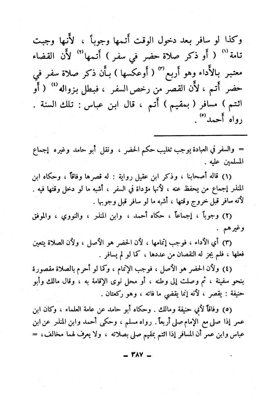 (¬5) وفاقا لأبي حنيفة ومالك، وحكاه أبو حامد عن عامة العلماء، وكان ابن عمر إذا صلى مع الإمام صلى أربعا، رواه مسلم وحكى أحمد وابن المنذر عن ابن عباس وابن عمر أن المسافر إذا ائتم بمقيم صلى بصلاته، ولا يعرف لهما مخالف فكان إجماعا.