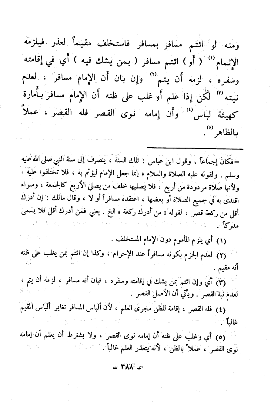 (¬5) أي وغلب على ظنه أن إمامه نوى القصر، ولا يشترط أن يعلم أن إمامه نوى القصر، عملا بالظن لأنه يتعذر العلم غالبا.