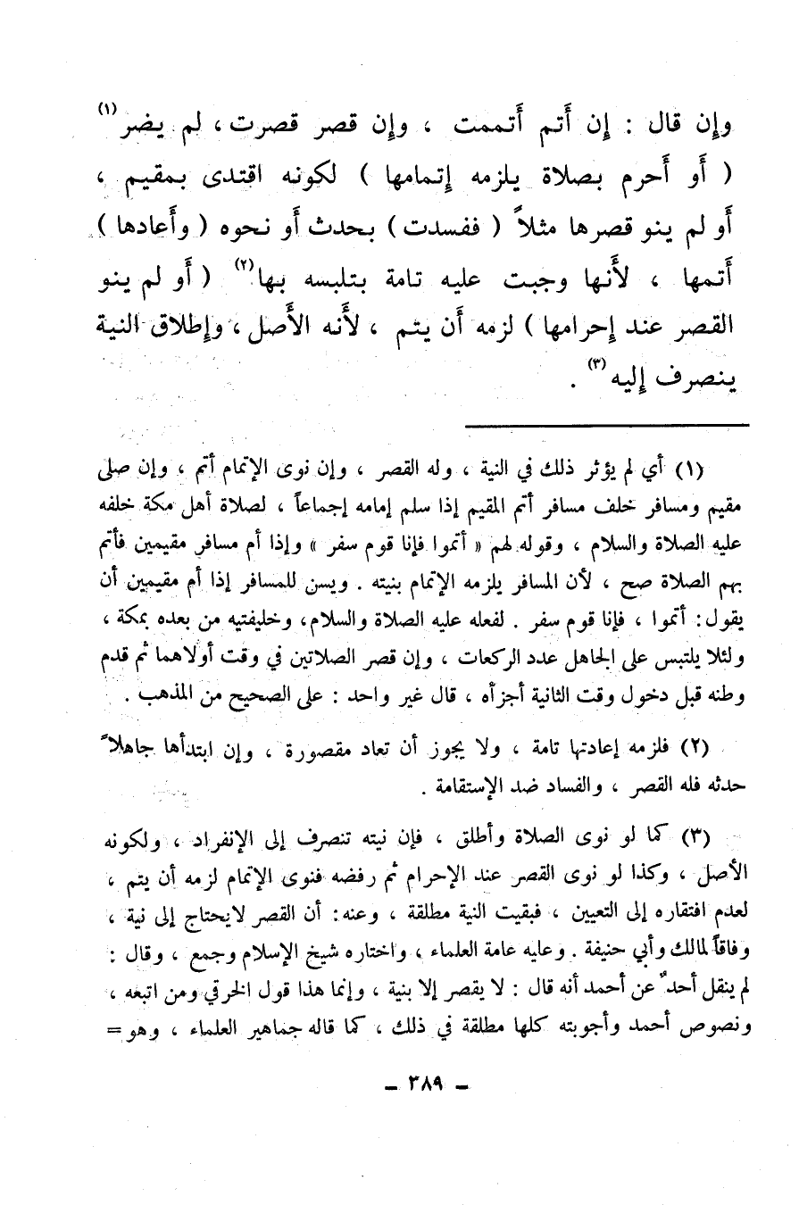 (¬3) كما لو نوى الصلاة وأطلق، فإن نيته تنصرف إلى الانفراد، ولكونه الأصل، وكذا لو نوى القصر عند الإحرام ثم رفضه فنوى الإتمام لزمه أن يتم لعدم افتقاره إلى التعيين، فبقيت النية مطلقة، وعنه: أن القصر لا يحتاج إلى نية وفاقا لمالك وأبي حنيفة، وعليه عامة العلماء.