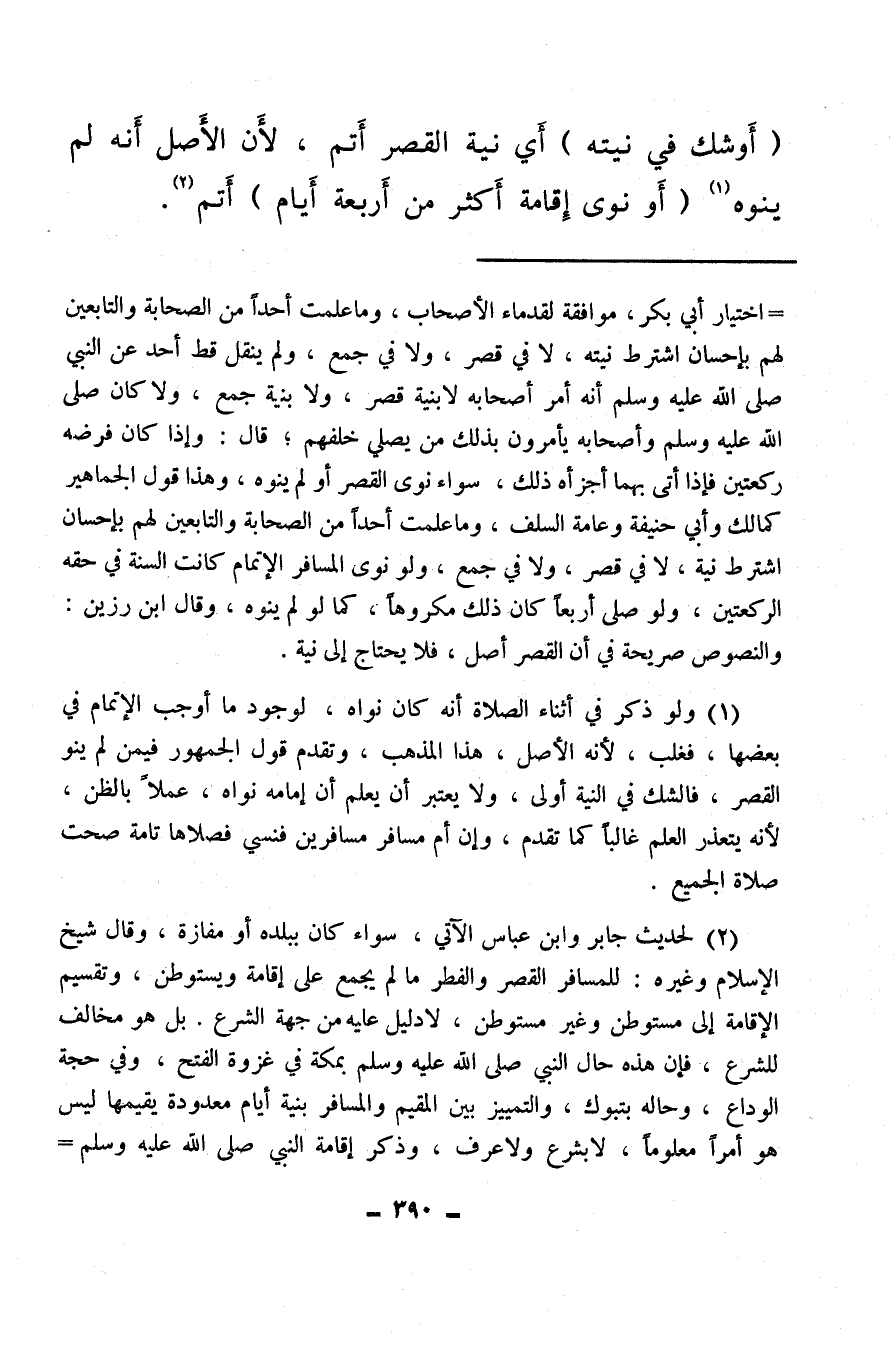 (¬1) ولو ذكر في أثناء الصلاة أنه كان نواه، لوجود ما أوجب الإتمام في بعضها، فغلب، لأنه الأصل، هذا المذهب، وتقدم قول الجمهور فيمن لم ينو القصر، فالشك في النية أولى، ولا يعتبر أن يعلم أن إمامه نواه، عملا بالظن، لأنه يتعذر العلم غالبا كما تقدم، وإن أم مسافر مسافرين فنسي فصلاها تامة صحت صلاة الجميع.
