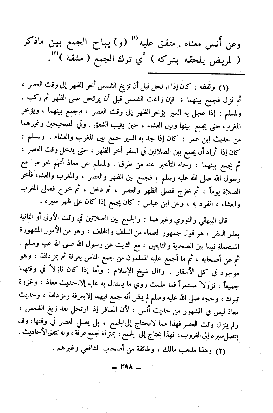 قال البيهقي والنووي وغيرهما: والجمع بين الصلاتين في وقت الأولى أو الثانية بعذر السفر، هو قول جمهور العلماء من السلف والخلف، وهو من الأمور المشهورة المستعملة فيما بين الصحابة والتابعين، مع الثابت عن رسول الله صلى الله عليه وسلم، ثم عن أصحابه، ثم ما أجمع عليه المسلمون من جمع الناس بعرفة ثم بمزدلفة هو موجود في كل الأسفار، وقال شيخ الإسلام: وأما إذا كان نازلا في وقتهما جميعا، نزولا مستمرا فما علمت روي ما يستدل به عليه إلا حديث معاذ، وغزوة تبوك وحجه صلى الله عليه وسلم لم ينقل أنه جمع فيهما إلا بعرفة ومزدلفة وحديث معاذ ليس في المشهور من حديث أنس، لأن المسافر إذا ارتحل بعد زيغ الشمس، ولم ينزل وقت العصر فهذا مما لا يحتاج إلى الجمع، بل يصلي العصر في وقتها، وقد يتصل سيره إلى الغروب فهذا يحتاج إلى الجمع، بمنزلة جمع عرفة، وبه تتفق الأحاديث.