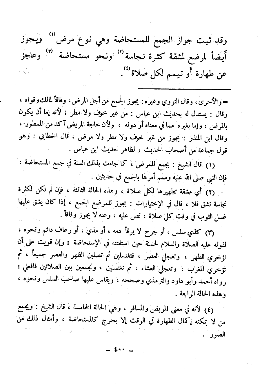 (¬1) قال الشيخ يجمع للمرض، كما جاءت بذلك السنة في جمع المستحاضة، فإن النبي صلى الله عليه وسلم أمرها بالجمع في حديثين.