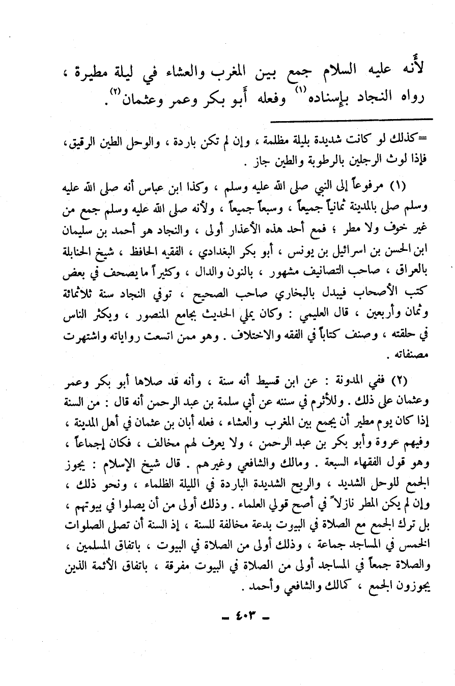 (¬1) مرفوعا إلى النبي صلى الله عليه وسلم وكذا ابن عباس أنه صلى الله عليه وسلم صلى بالمدينة ثمانيا جميعا، وسبعا جميعا ولأنه صلى الله عليه وسلم جمع من غير خوف ولا مطر، فمع أحد هذه الأعذار أولى، والنجاد هو أحمد بن سليمان بن الحسن بن إسرائيل بن يونس، أبو بكر البغدادي، الفقيه الحافظ شيخ الحنابلة بالعراق، صاحب التصانيف مشهور، بالنون والدال، وكثيرا ما يصحف في بعض كتب الأصحاب فيبدل بالبخاري صاحب الصحيح، توفي النجاد سنة ثلاثمائة وثمان وأربعين، قال العليمي: وكان يملي الحديث بجامع المنصور، ويكثر الناس في حلقته، وصنف كتابا في الفقه والاختلاف، وهو ممن اتسعت رواياته واشتهرت مصنفاته.
