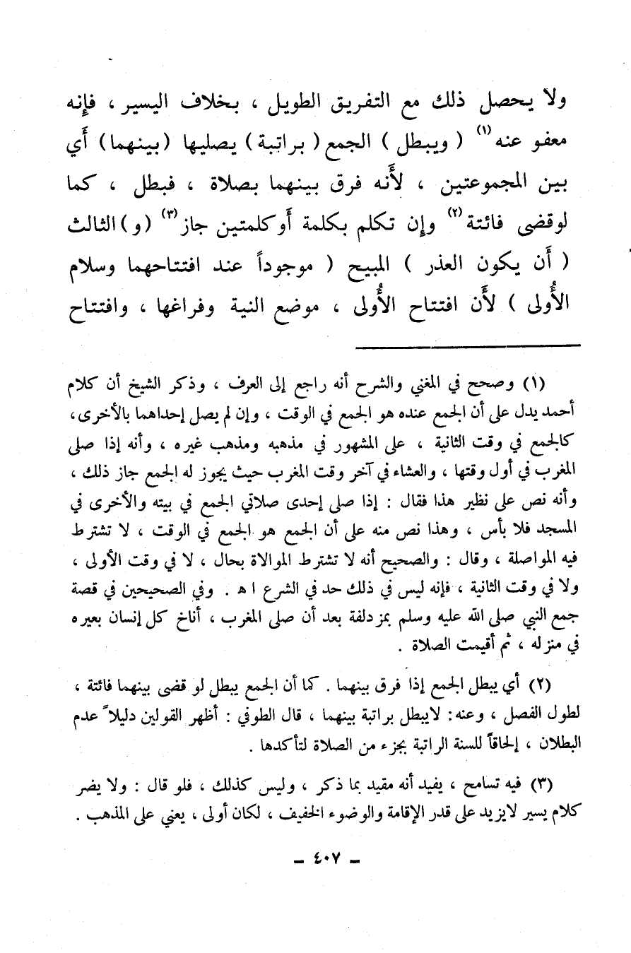 (¬2) أي يبطل الجمع إذا فرق بينهما، كما أن الجمع يبطل لو قضى بينهما فائتة، لطول الفصل، وعنه: لا يبطل براتبة بينهما، قال الطوفي: أظهر القولين دليلا عدم البطلان، إلحاقا، للسنة الراتبة بجزء من الصلاة لتأكدها.