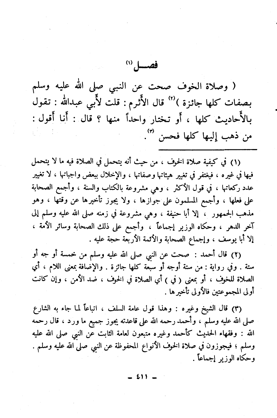 (¬3) قال الشيخ وغيره: وهذا قول عامة السلف، اتباعا لما جاء به الشارع صلى الله عليه وسلم وأحمد رحمه الله على قاعدته يجوز جميع ما ورد، قال رحمه الله: وفقهاء الحديث كأحمد وغيره متبعون لعامة الثابت عن النبي صلى الله عليه وسلم فيجوزون في صلاة الخوف الأنواع المحفوظة عن النبي صلى الله عليه وسلم وحكاه الوزير إجماعا.