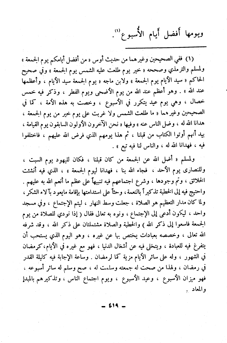 (¬1) ففي الصحيحين وغيرهما من حديث أوس «من أفضل أيامكم يوم الجمعة» ولمسلم والترمذي وصححه «خير يوم طلعت عليه الشمس يوم الجمعة» ، وفي صحيح الحاكم: «سيد الأيام يوم الجمعة» ، ولابن ماجه «يوم الجمعة سيد الأيام، وأعظمها عند الله» ، وهو أعظم عند الله من يوم الأضحى ويوم الفطر، وذكر فيه خمس خصال، وهي يوم عيد يتكرر في الأسبوع، وخصت به هذه الأمة، كما في الصحيحين وغيرهما «ما طلعت الشمس ولا غربت على يوم خير من يوم القيامة، هدانا الله له، وضل الناس عنه» ، وفيها «نحن الآخرون الأولون السابقون يوم الجمعة بيد أنهم أوتوا الكتاب من قبلنا، ثم هذا يومهم الذي فرض الله عليهم، فاختلفوا فيه، فهدانا لله له، والناس لنا فيه تبع» .