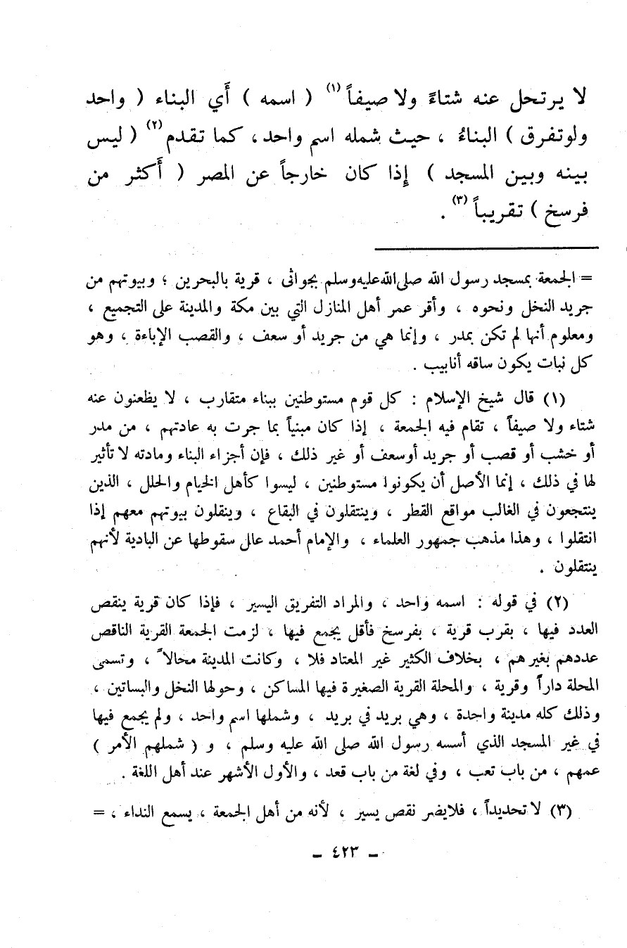 لا يرتحل عنه شتاءً ولا صيفًا (¬1) (اسمه) أي البناء (واحد ولو تفرق) البناء حيث شمله اسم واحد، كما تقدم (¬2) (ليس بينه وبين المسجد) إذا كان خارجًا عن المصر (أكثر من فرسخ) تقريبًا (¬3) .