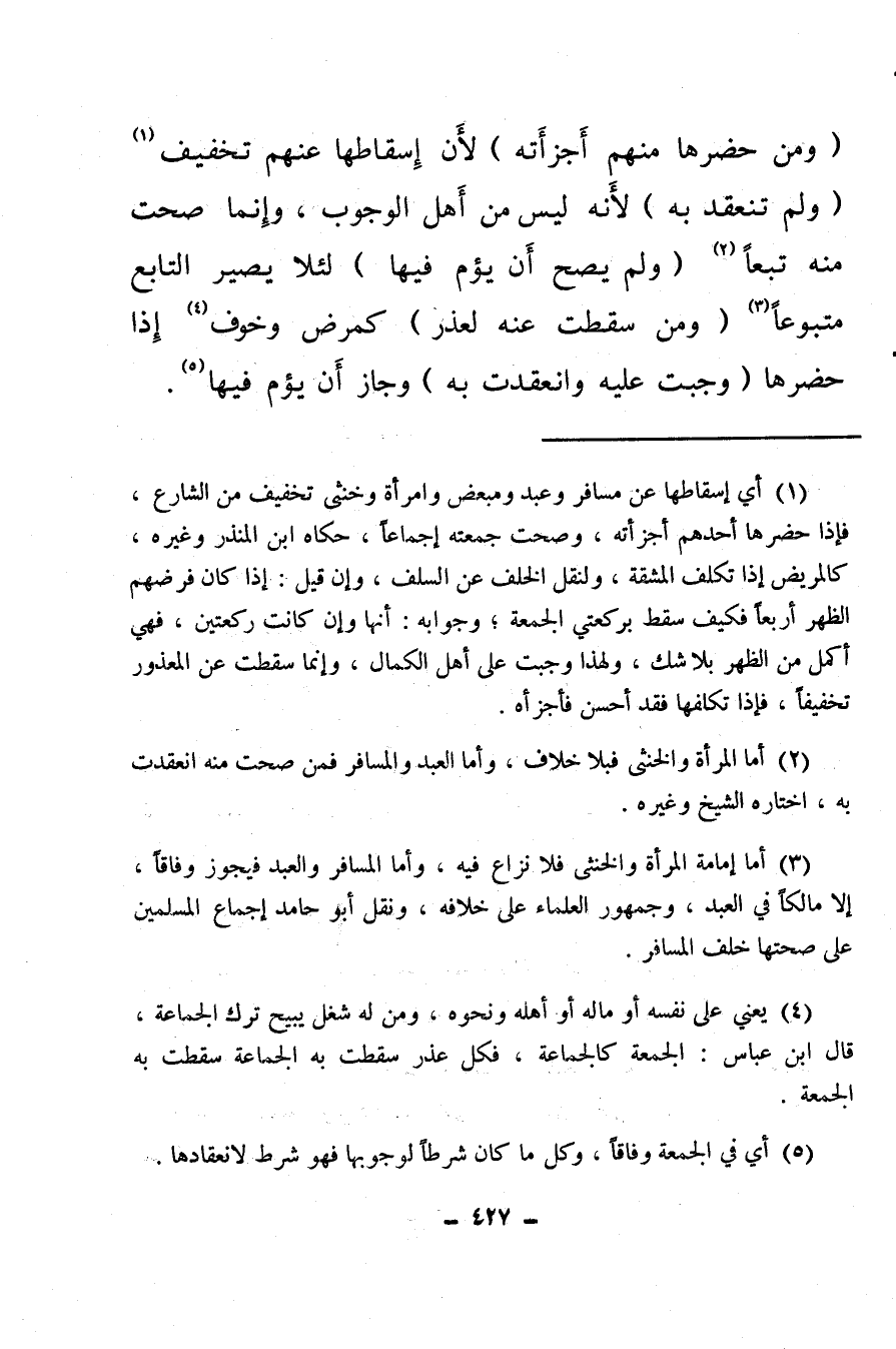(ومن حضرها منهم أجزأته) لأن إسقاطها عنهم تخفيف (¬1) (ولم تنعقد به) لأنه ليس من أهل الوجوب، وإنما صحت منه تبعا (¬2) (ولم يصح أن يؤم فيها) لئلا يصير التابع متبوعًا (¬3) (ومن سقطت عنه لعذر) كمرض وخوف (¬4) إذا حضرها (وجبت عليه وانعقدت به) وجاز أن يؤم فيها (¬5) .
