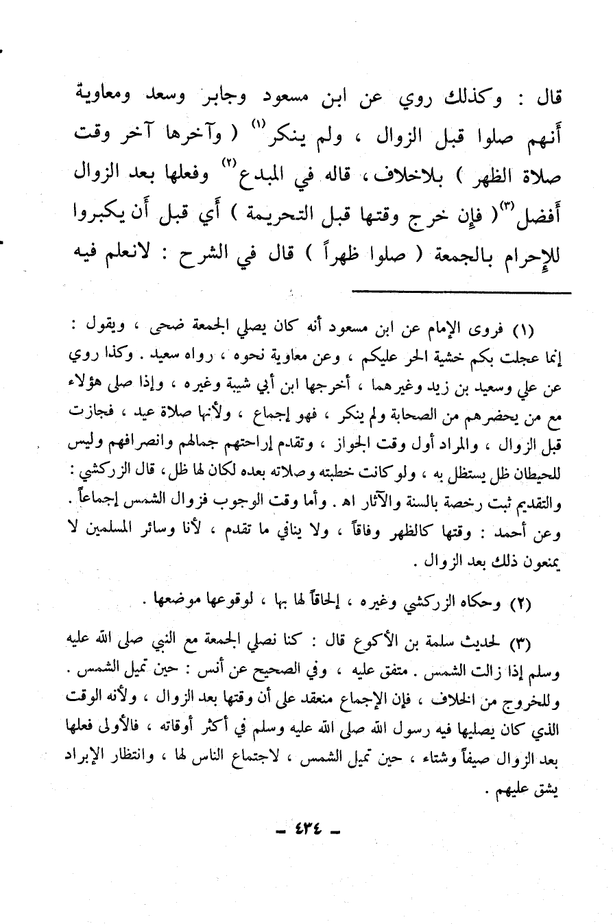 (¬3) لحديث سلمة بن الأكوع، قال: كنا نصلي الجمعة مع النبي صلى الله عليه وسلم إذا زالت الشمس، متفق عليه، وفي الصحيح عن أنس: حين تميل الشمس، وللخروج من الخلاف، فإن الإجماع منعقد على أن وقتها بعد الزوال، ولأنه الوقت الذي كان يصليها فيه رسول الله صلى الله عليه وسلم في أكثر أوقاته، فالأولى فعلها بعد الزوال صيفا وشتاء، حين تميل الشمس، لاجتماع الناس لها، وانتظار الإبراد يشق عليهم.