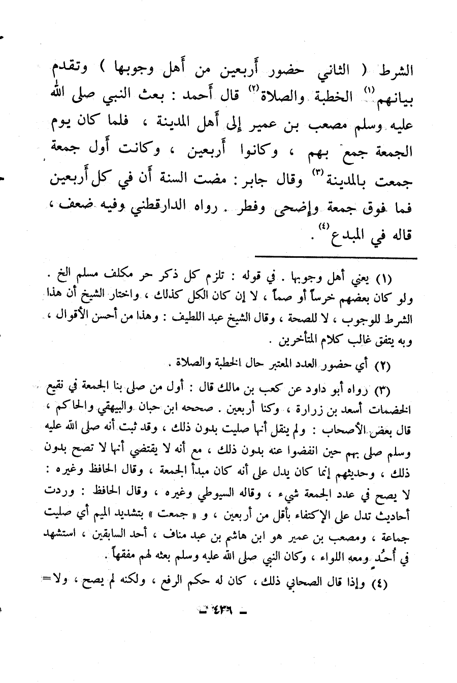 (¬3) رواه أبو داود عن كعب بن مالك قال: أول من صلى بنا الجمعة في نقيع الخصُمات أسعد بن زرارة وكنا أربعين صححه ابن حبان والبيهقي والحاكم قال بعض الأصحاب: ولم ينقل أنها صليت بدون ذلك، وقد ثبت أنه صلى الله عليه وسلم صلى بهم حين انفضوا عنه بدون ذلك، مع أنه لا يقتضي أنها لا تصح بدون ذلك، وحديثهم إنما كان يدل على أنه كان مبدأ الجمعة، وقال الحافظ وغيره، لا يصح في عدد الجمعة شيء، وقاله السيوطي وغيره، وقال الحافظ: وردت أحاديث تدل على الاكتفاء بأقل من أربعين وجمعت بتشديد الميم أي صليت جماعة ومصعب بن عمير هو ابن هاشم بن عبد مناف، أحد السابقين، استشهد في أحد ومعه اللواء، وكان النبي صلى الله عليه وسلم بعثه لهم مفقها.