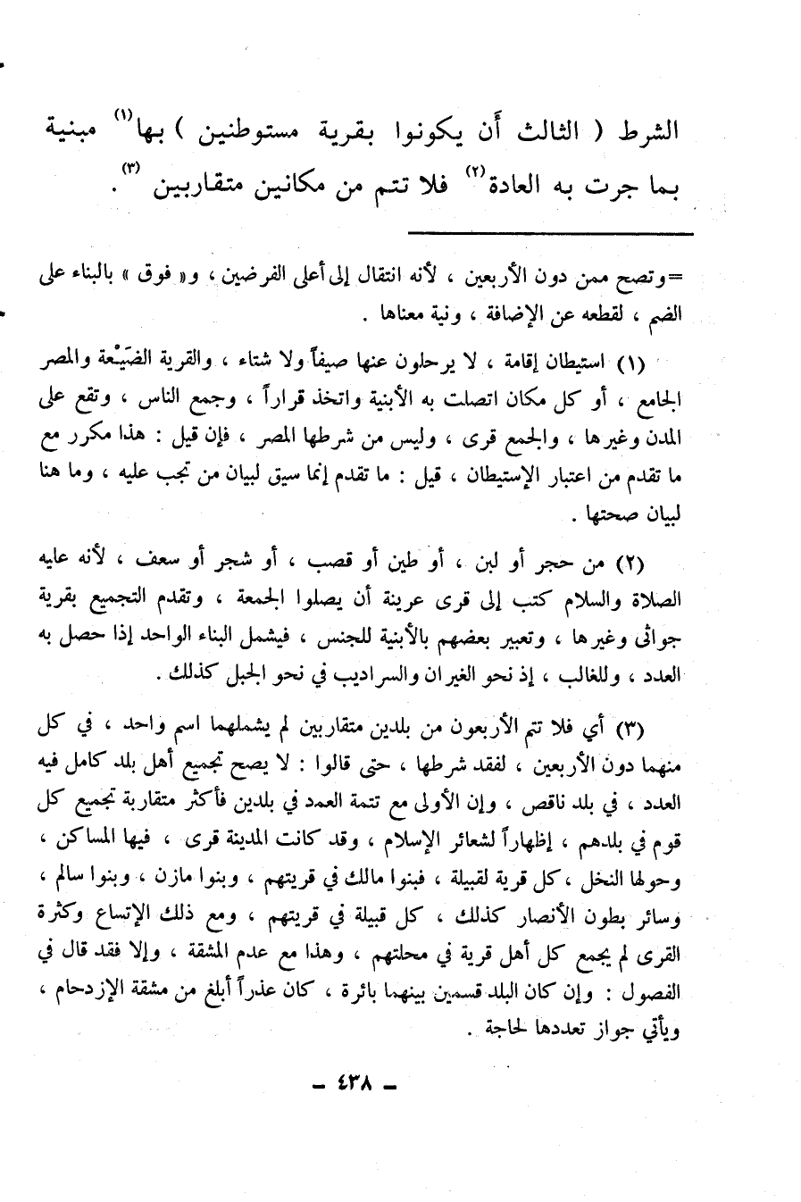 (¬1) استيطان إقامة، لا يرحلون عنها صيفا ولا شتاء، والقرية الضيعة والمصر الجامع، أو كل مكان اتصلت به الأبنية واتخذ قرارا، وجمع الناس وتقع على المدن وغيرها، والجمع قرى، وليس من شرطها المصر، فإن قيل، هذا مكرر مع ما تقدم من اعتبار الاستيطان، قيل: ما تقدم إنما سيق لبيان من تجب عليه وما هنا لبيان صحتها.