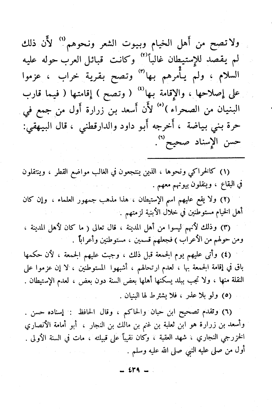 ولا تصح من أهل الخيام وبيوت الشعر ونحوهم (¬1) لأن ذلك لم يقصد للاستيطان غالبا (¬2) وكانت قبائل العرب حوله عليه السلام، ولم يأمرهم بها (¬3) وتصح بقرية خراب، عزموا على إصلاحها والإقامة بها (¬4) (وتصح) إقامتها (فيما قارب البنيان من الصحراء) (¬5) لأن أسعد بن زرارة أول من جمع في حرة بني بياضة، أخرجه أبو داود والدارقطني، قال البيهقي حسن الإسناد صحيح (¬6) .