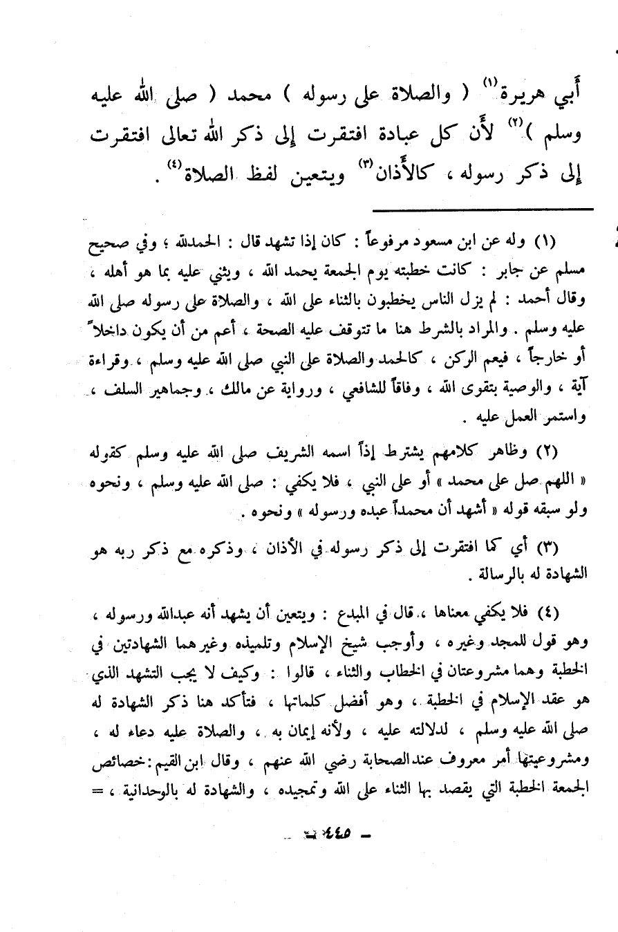 أبي هريرة (¬1) (والصلاة على رسوله) محمد (صلى الله عليه وسلم) (¬2) لأن كل عبادة افتقرت إلى ذكر الله تعالى افتقرت إلى ذكر رسوله، كالأذان (¬3) ويتعين لفظ الصلاة (¬4) .