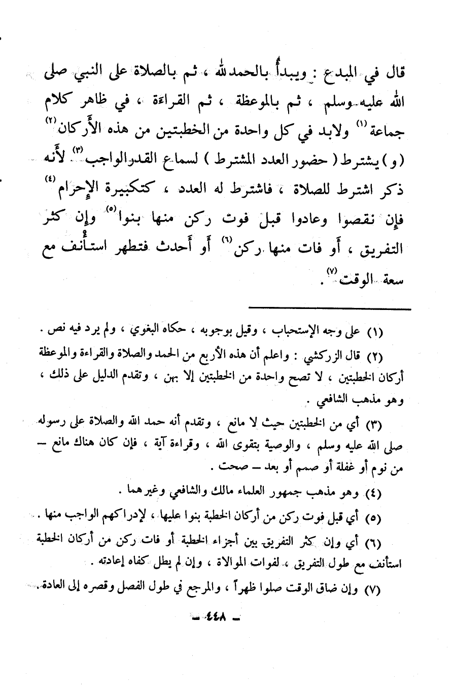 (¬2) قال الزركشي، واعلم أن هذه الأربع من الحمد والصلاة والقراءة والموعظة أركان الخطبتين، لا تصح واحدة من الخطبتين إلا بهن، وتقدم الدليل على ذلك وهو مذهب الشافعي.