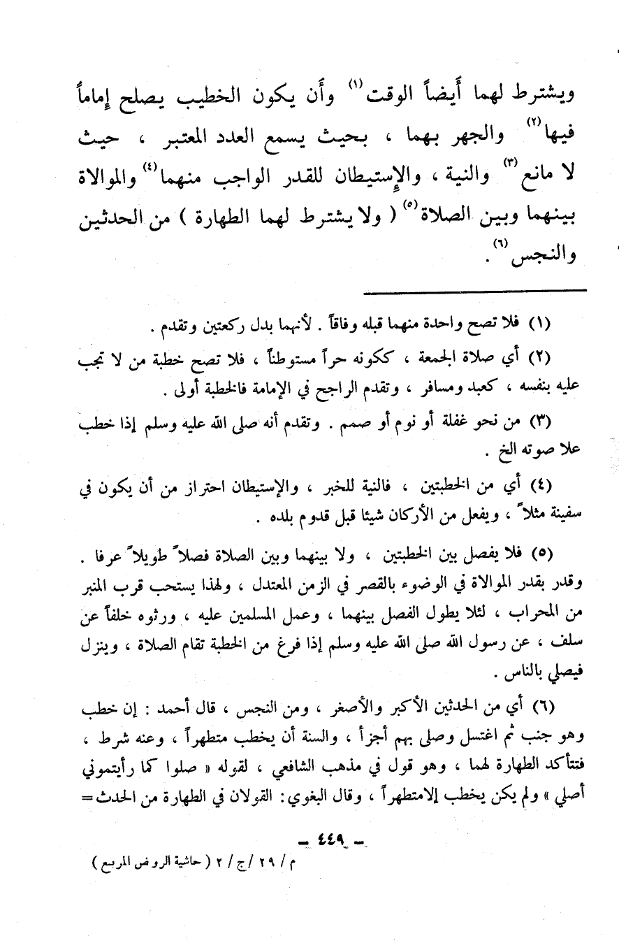 (¬6) أي من الحدثين الأكبر والأصغر، ومن النجس، قال أحمد: إن خطب وهو جنب ثم اغتسل وصلى بهم أجزأ والسنة أن يخطب متطهرا، وعنه شرط، فتتأكد الطهارة لهما، وهو قول في مذهب الشافعي، لقوله: «صلوا كما رأيتموني أصلي» ولم يكن يخطب إلا متطهرا وقال البغوي: القولان في الطهارة من الحدث