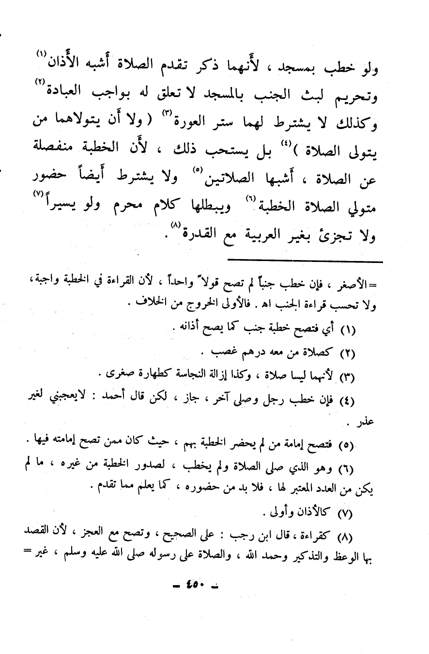 ولو خطب بمسجد، لأنهما ذكر تقدم الصلاة أشبه الأذان (¬1) وتحريم لبث الجنب بالمسجد لا تعلق له بواجب العبادة (¬2) وكذلك لا يشترط لهما ستر العورة (¬3) (ولا أن يتولاهما من يتولى الصلاة) (¬4) بل يستحب ذلك، لأن الخطبة منفصلة عن الصلاة، أشبها الصلاتين (¬5) ولا يشترط أيضا حضور متولي الصلاة الخطبة (¬6) ويبطلها كلام محرم ولو يسيرا (¬7) ولا تجزئ بغير العربية مع القدرة (¬8) .