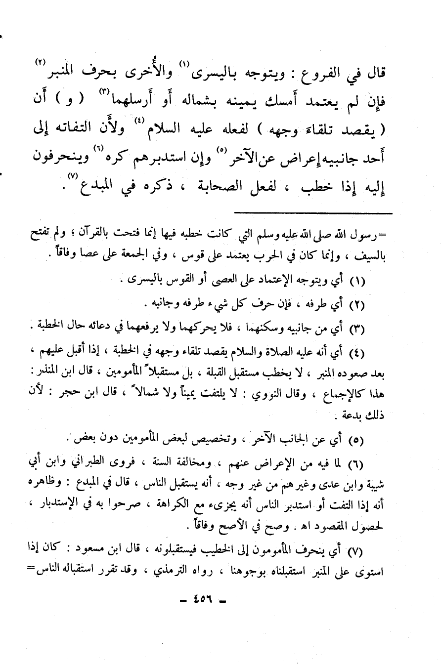 (¬4) أي أنه عليه الصلاة والسلام يقصد تلقاء وجهه في الخطبة، إذا أقبل عليهم بعد صعوده المنبر، لا يخطب مستقبل القبلة، بل مستقبلا المأمومين قال ابن المنذر: هذا كالإجماع، وقال النووي: لا يلتفت يمينا ولا شمالا، قال ابن حجر، لأن ذلك بدعة.