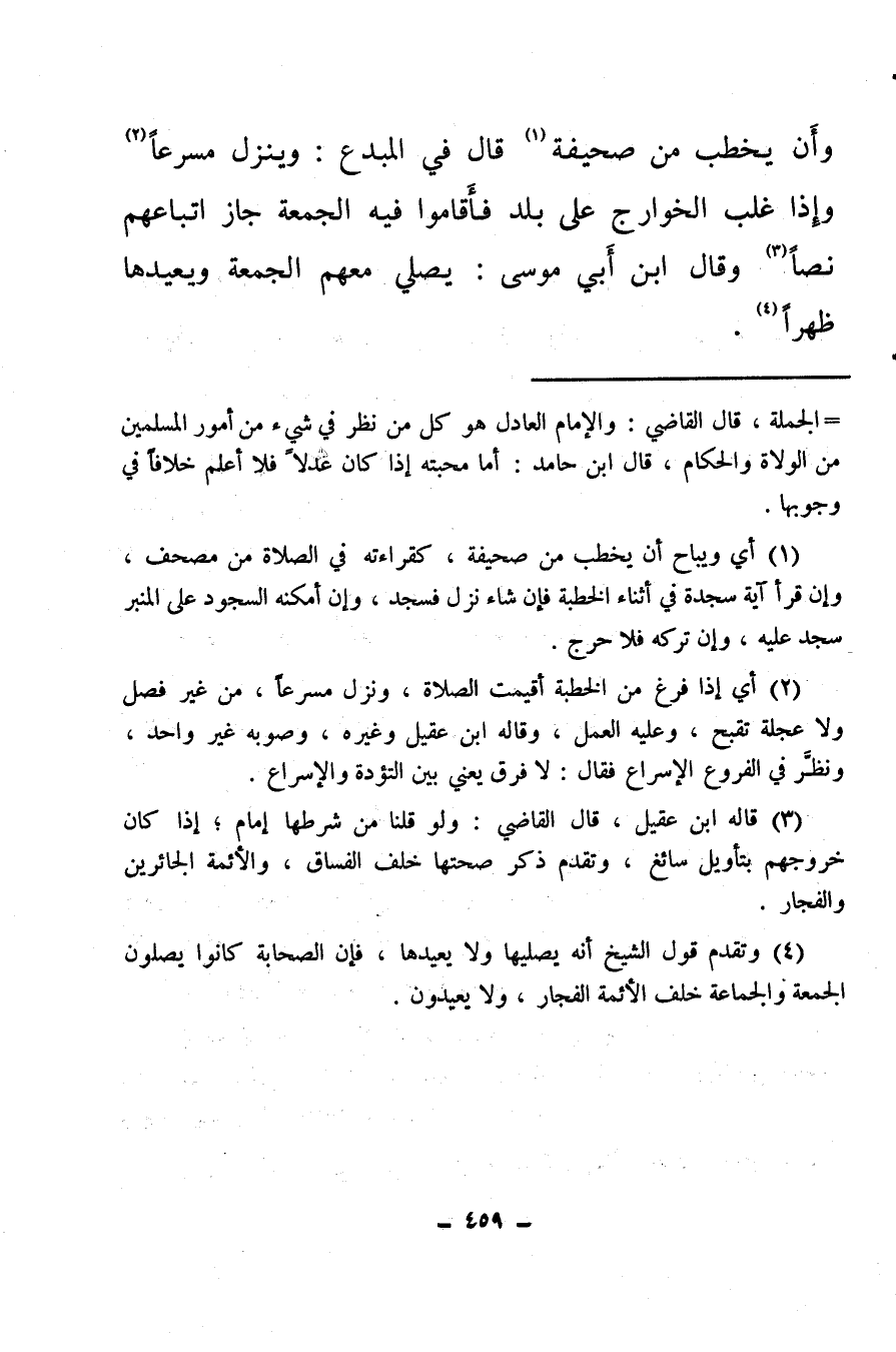 (¬3) قاله ابن عقيل: قال القاضي: ولو قلنا من شرطها إمام، إذا كان خروجهم بتأويل سائغ، وتقدم ذكر صحتها خلف الفساق، والأئمة الجائرين والفجار.