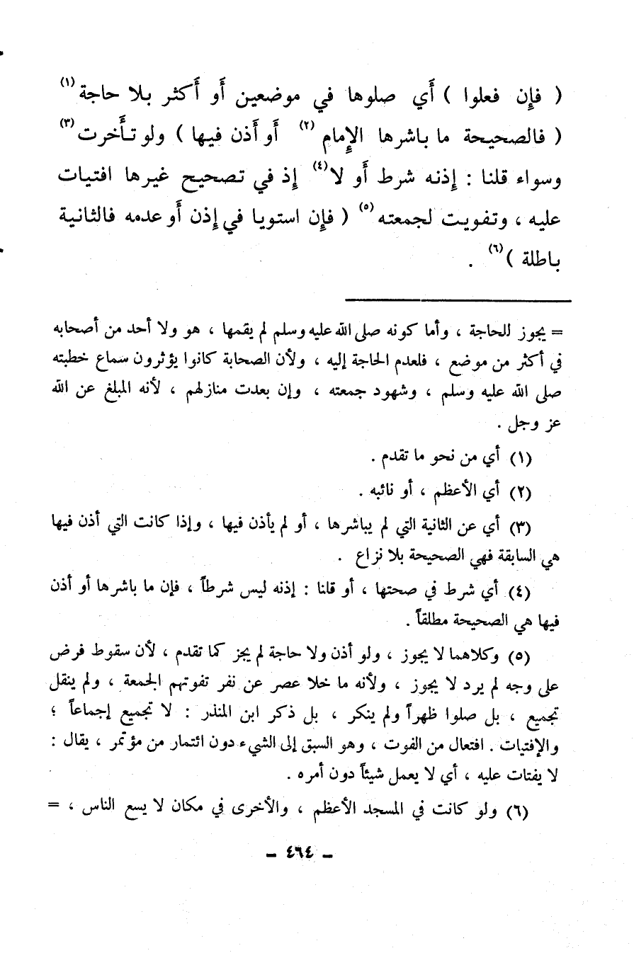 (¬5) وكلاهما لا يجوز، ولو أذن ولا حاجة لم يجز كما تقدم، لأن سقوط فرض على وجه لم يرد لا يجوز، ولأنه ما خلا عصر عن نفر تفوتهم الجمعة، ولم ينقل تجميع، بل صلوا ظهرا ولم ينكر، بل ذكر ابن المنذر، لا تجميع إجماعا، والإفتيات افتعال من الفوت، وهو السبق إلى الشيء دون ائتمار من مؤتمر، يقال: لا يفتات عليه، أي لا يعمل شيئا دون أمره.