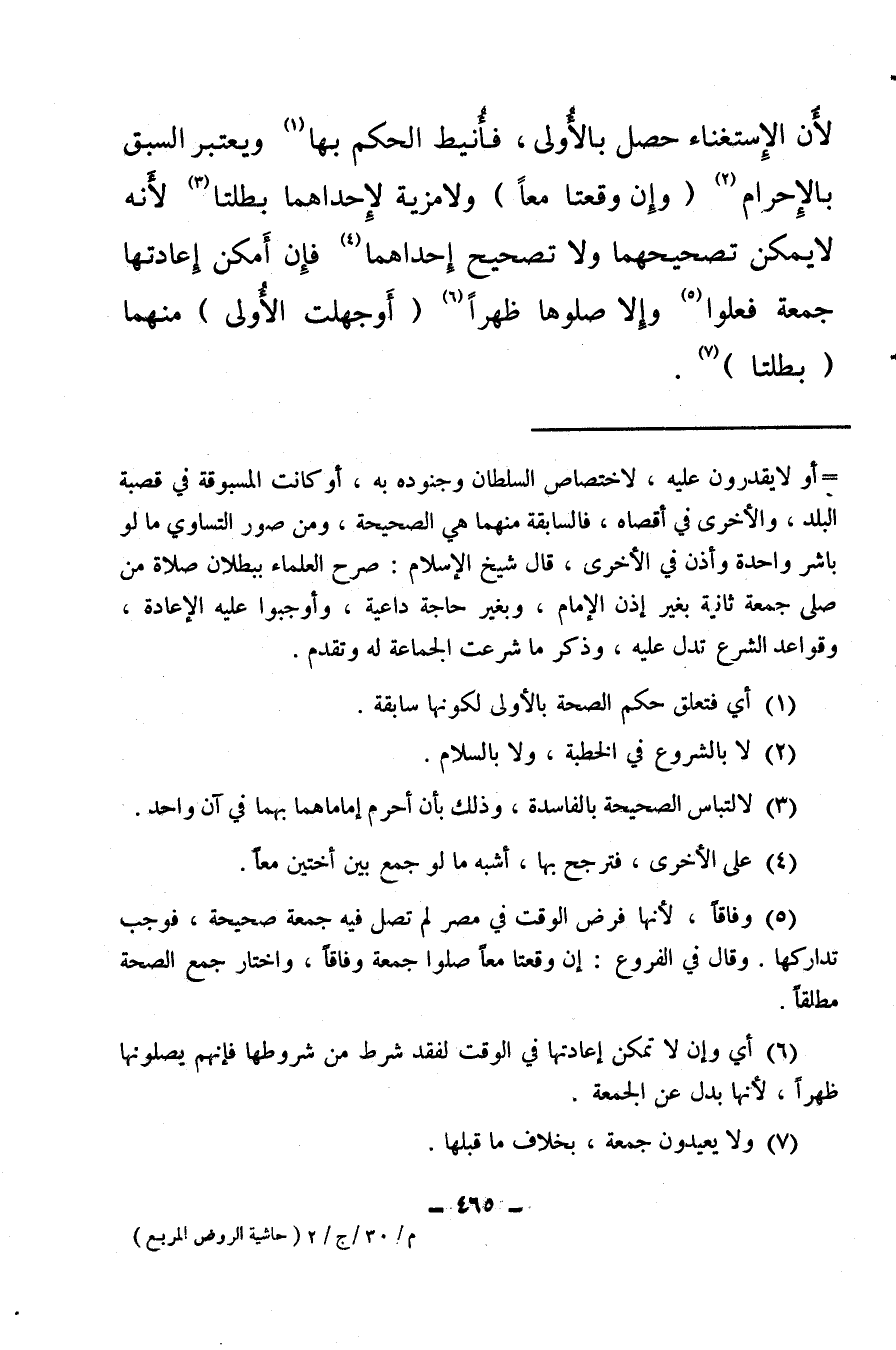 لأن الاستغناء حصل بالأولى، فأنيط الحكم بها (¬1) ، ويعتبر السبق بالإحرام (¬2) (وإن وقعتا معا) ولا مزية لإحداهما بطلتا (¬3) لأنه لا يمكن تصحيحهما ولا تصحيح إحداهما (¬4) فإن أمكن إعادتها جمعة فعلوا (¬5) وإلا صلوها ظهرا (¬6) (أو جهلت الأولى) منهما بطلتا (¬7) .