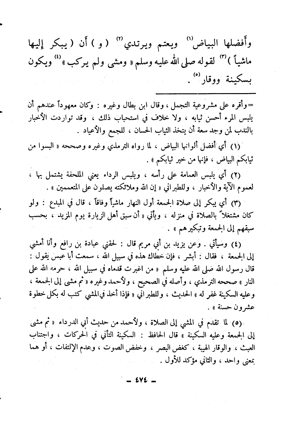 (¬5) لما تقدم في المشي إلى الصلاة ولأحمد من حديث أبي الدرداء «ثم مشى إلى الجمعة وعليه السكينة» ، قال الحافظ: السكينة التأني في الحركات، واجتناب العبث، والوقار الهيبة، كغض البصر، وخفض الصوت، وعدم الالتفات، أو هما بمعنى واحد، والثاني مؤكد للأول.