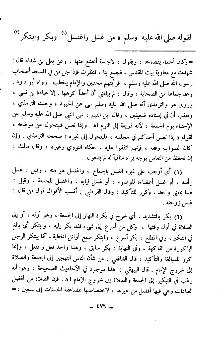 (¬2) بكر بالتشديد أي خرج في بكرة النهار إلى الجمعة، وهو أوله، أو إلى الصلاة في أول وقتها، وكل من أسرع إلى شيء فقد بكر إليه، وابتكر أي بالغ في التبكير، وفي المطلع، بكر أسرع، وابتكر سمع أوائل الخطبة، كما يبتكر الرجل الباكورة من الفاكهة.