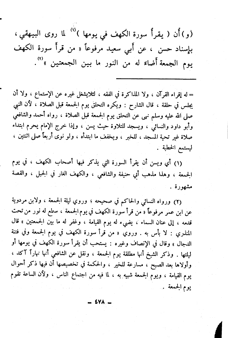 (¬2) ورواه النسائي والحاكم في صحيحه، وروي ليلة الجمعة، ولابن مردوية عن ابن عمر مرفوعا: «من قرأ سورة الكهف في يوم الجمعة سطع له نور من تحت قدمه، إلى عنان السماء، يضيء له يوم القيامة، وغفر له ما بين الجمعتين» ، قال المنذري: «لا بأس به، وروي من قرأ سورة الكهف في يوم الجمعة وقي فتنة الدجال» ، وقال في الإنصاف وغيره: يستحب أن يقرأ سورة الكهف في يومها أو ليلتها، وذكر الشيخ أنها مطلقة يوم الجمعة، ونقل عن الشافعي أنها نهارا آكد، وأولاها بعد الصبح، مسارعة للخير، والحكمة في تخصيصها أن فيها ذكر أحوال يوم القيامة، ويوم الجمعة شبيه به، لما فيه من اجتماع الناس، ولأن الساعة تقوم يوم الجمعة.