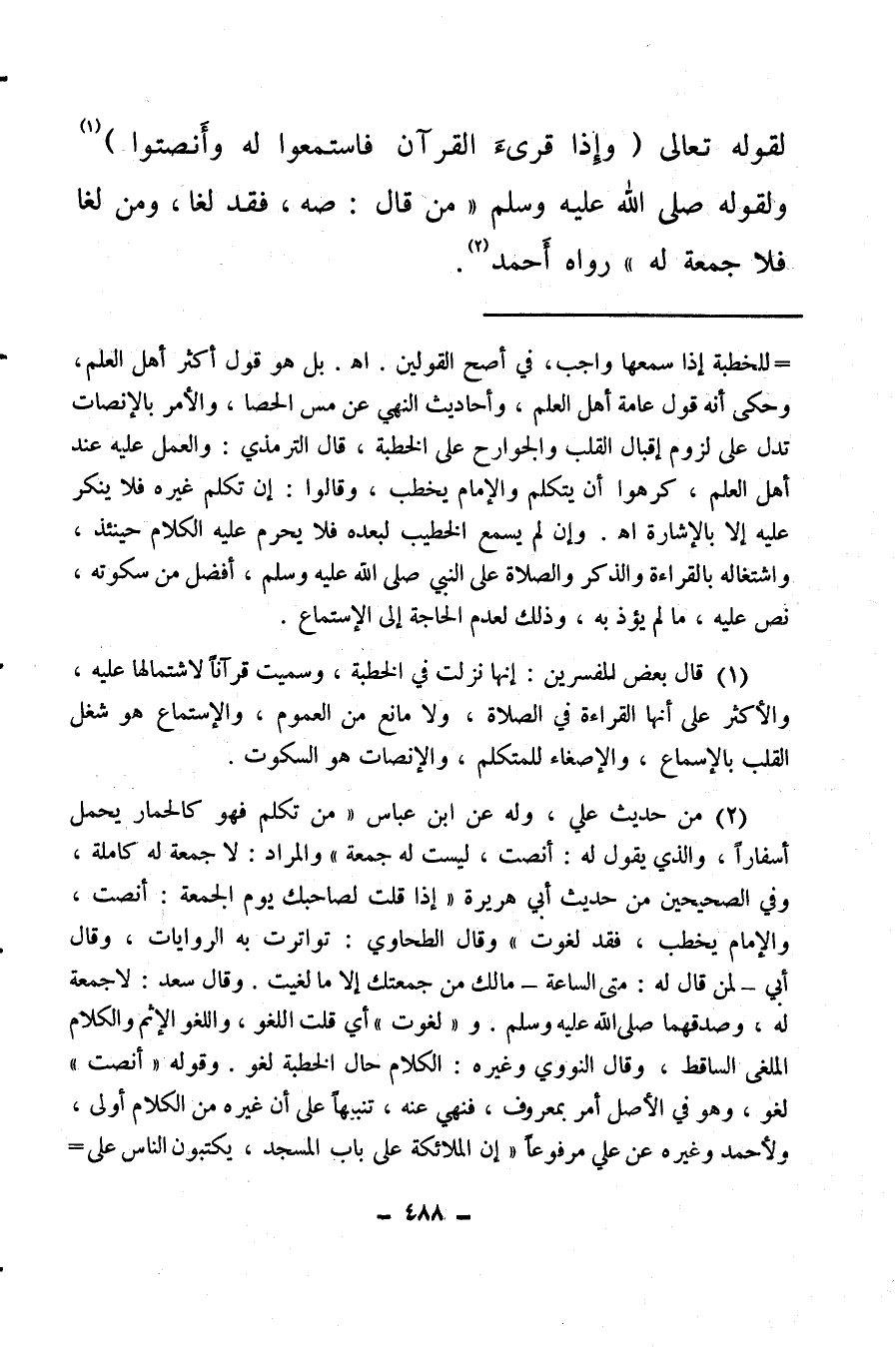 (¬2) من حديث علي، وله عن ابن عباس: «من تكلم فهو كالحمار يحمل أسفارا والذي يقول له: أنصت ليس له جمعة» ، والمراد: لا جمعة له كاملة وفي الصحيحين من حديث أبي هريرة: «إذا قلت لصاحبك يوم الجمعة أنصت والإمام يخطب، فقد لغوت» ، وقال الطحاوي، تواترت به الروايات، وقال أبي لمن قال له متى الساعة ما لك من جمعتك إلا ما لغيت وقال سعد: لا جمعة له وصدقهما صلى الله عليه وسلم ولغوت أي قلت اللغو، واللغو الإثم والكلام الملغي الساقط، وقال النووي وغيره: الكلام حال الخطبة لغو، وقوله أنصت لغو، وهو في الأصل أمر بمعروف، فنهي عنه، تنبيها على أن غيره من الكلام أولى، ولأحمد وغيره عن علي مرفوعا: «إن الملائكة على باب المسجد يكتبون الناس على