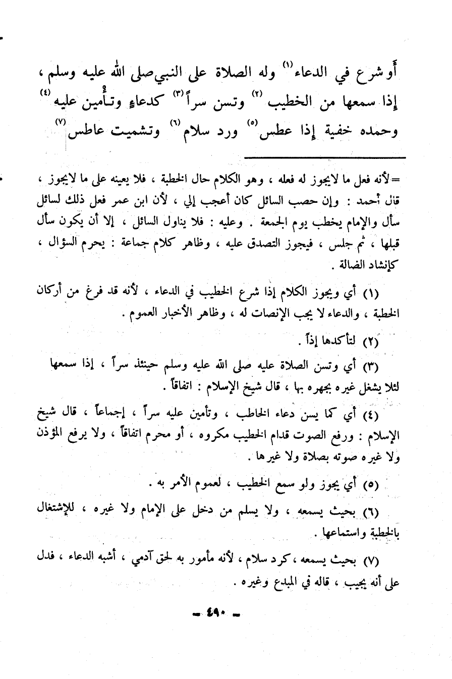 أو شرع في الدعاء (¬1) وله الصلاة على النبي صلى الله عليه وسلم إذا سمعها من الخطيب (¬2) وتسن سرا (¬3) كدعاء وتأمين عليه (¬4) وحمده خفية إذا عطس (¬5) ورد سلام (¬6) وتشميت عاطس (¬7) .