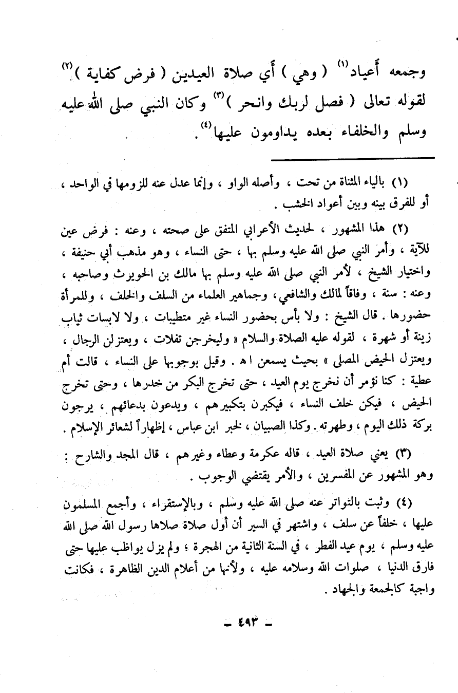 وجمعه أعياد (¬1) (وهي) أي صلاة العيدين (فرض كفاية) (¬2) لقوله تعالى: {فَصَلِّ لِرَبِّكَ وَانْحَرْ} (¬3) وكان النبي صلى الله عليه وسلم والخلفاء بعده يداومون عليها (¬4) .