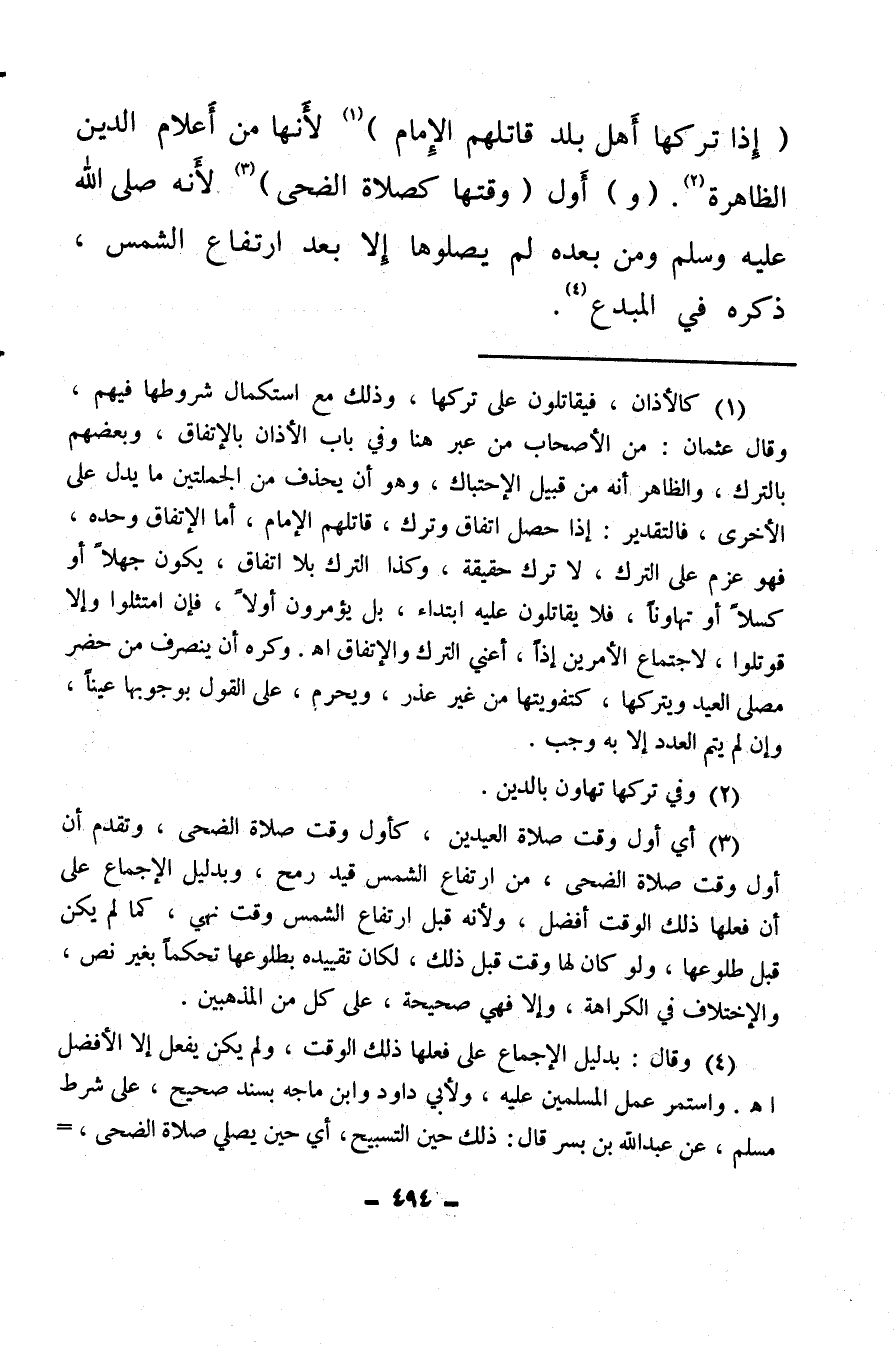 (إذا تركها أهل بلد قاتلهم الإمام) (¬1) لأنها من أعلام الدين الظاهرة (¬2) (و) أول (وقتها كصلاة الضحى) (¬3) لأنه صلى الله عليه وسلم ومن بعده لم يصلوها إلا بعد ارتفاع الشمس، ذكره في المبدع (¬4) .