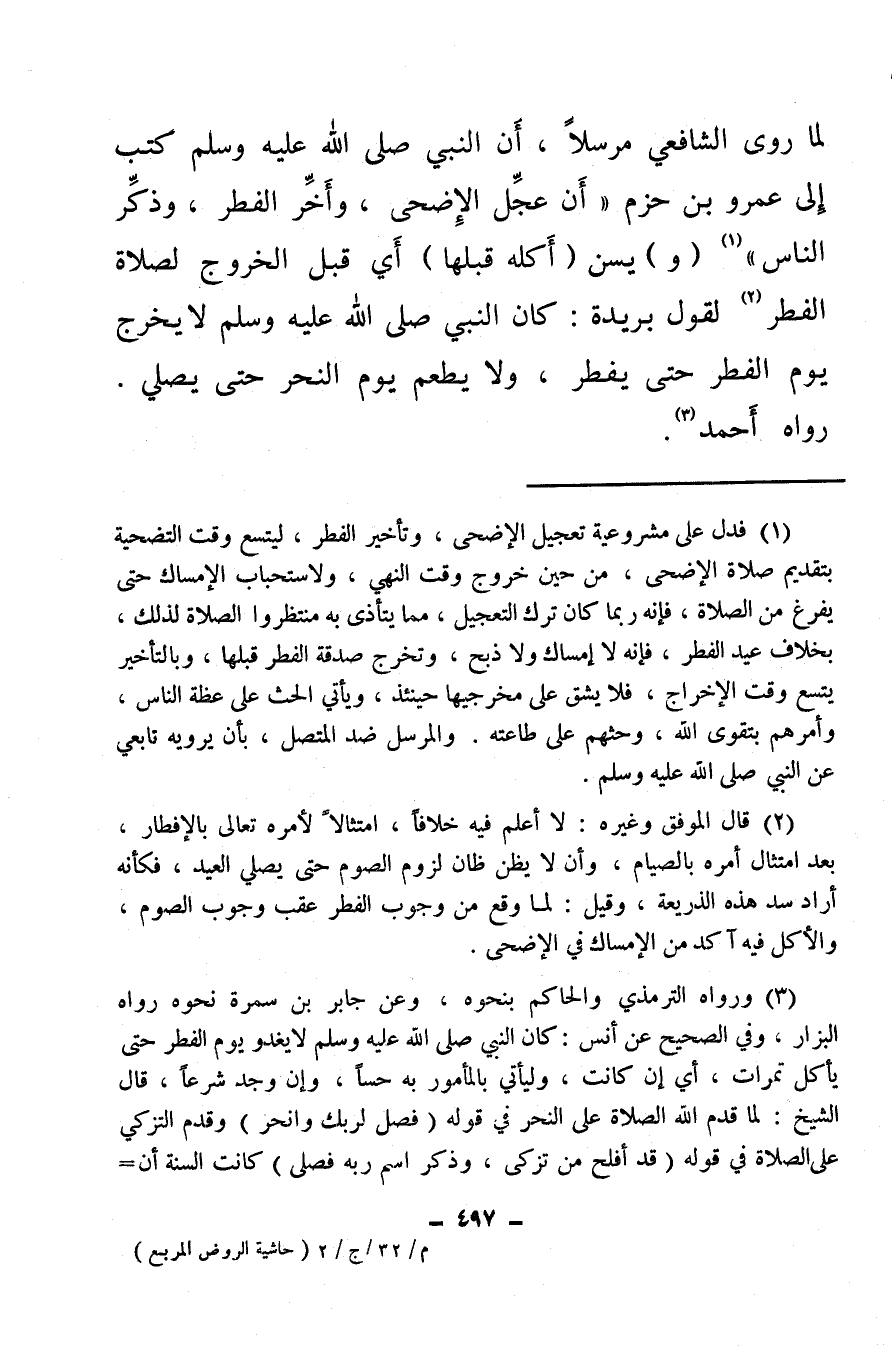 (¬3) ورواه الترمذي والحاكم بنحوه، وعن جابر بن سمرة نحوه، ورواه البزار، وفي الصحيح عن أنس، كان النبي صلى الله عليه وسلم لا يغدوا يوم الفطر حتى يأكل تمرات، أي إن كانت، وليأتي بالمأمور به حسا، وإن وجد شرعا، قال الشيخ: لما قدم الله الصلاة على النحر في قوله: {فَصَلِّ لِرَبِّكَ وَانْحَرْ} وقدم التزكي على الصلاة في قوله: {قَدْ أَفْلَحَ مَنْ تَزَكَّى * وَذَكَرَ اسْمَ رَبِّهِ فَصَلَّى} كانت السنة أن الصدقة قبل الصلاة في عيد الفطر وأن الذبح بعد الصلاة في عيد النحر، وذكر أن مقصود الصوم التقوى، وهو من معنى التزكي وفرض بعده صدقة الفطر، طهرة للصائم من اللغو والرفث فالصدقة من تمام طهرة الصوم، وكلاهما تزك، فتقدم على صلاة العيد.