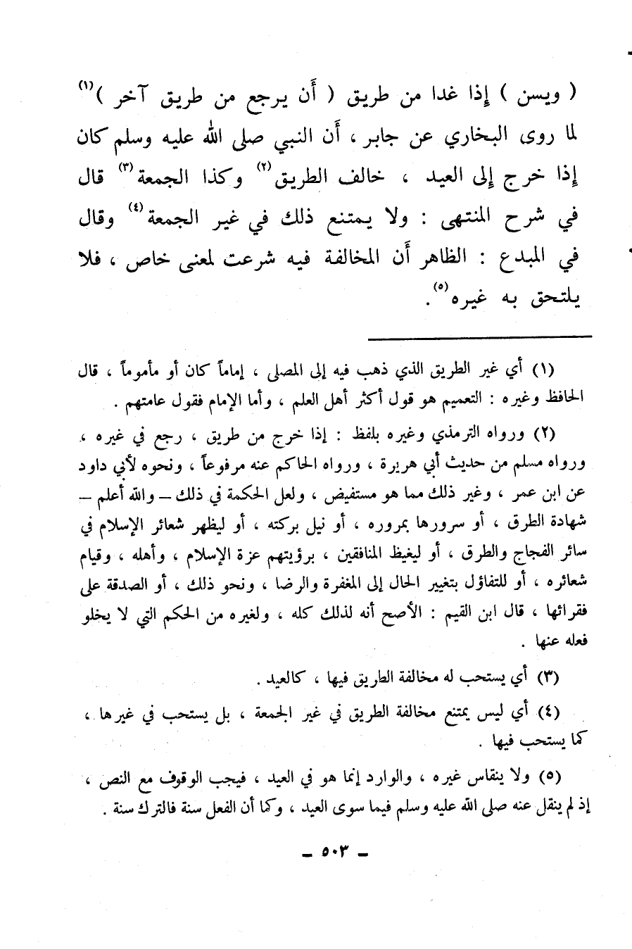 (ويسن) إذا غدا من طريق (أن يرجع من طريق آخر) (¬1) لما روى البخاري عن جابر، أن النبي صلى الله عليه وسلم كان إذا خرج إلى العيد، خالف الطريق (¬2) وكذا الجمعة (¬3) قال في شرح المنتهى: ولا يمنتع ذلك في غير الجمعة (¬4) وقال في المبدع: الظاهر أن المخالفة فيه شرعت لمعنى خاص فلا يلتحق به غيره (¬5) .