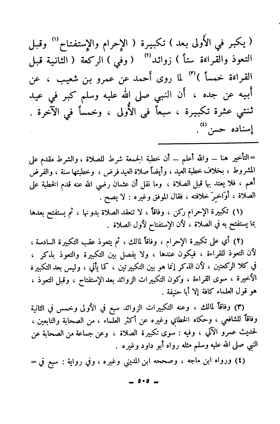 (¬3) وفاقا لمالك، وعنه التكبيرات الزوائد سبع في الأولى، وخمس في الثانية وفاقا للشافعي، وحكاه الخطابي وغيره عن أكثر العلماء، من الصحابة والتابعين لحديث عمرو الآتي، وفيه سوى تكبيرة الصلاة، وعن جماعة من الصحابة عن النبي صلى الله عليه وسلم مثله رواه أبو داود وغيره.