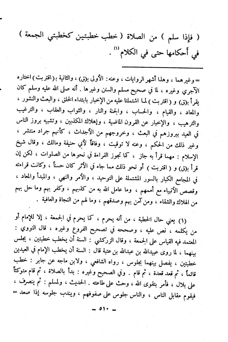 (¬1) يعني حال الخطبة من أنه يحرم، كما يحرم في الجمعة، إلا للإمام أو من يكلمه نص عليه، وصححه في تصحيح الفروع وغيره، قال النووي: المعتمد فيه القياس على الجمعة، وقال الزركشي: السنة أن يخطب خطبتين، يجلس بينهما، لما روى عبيد الله بن عبد الله بن عتبة قال: السنة أن يخطب الإمام في العيدين