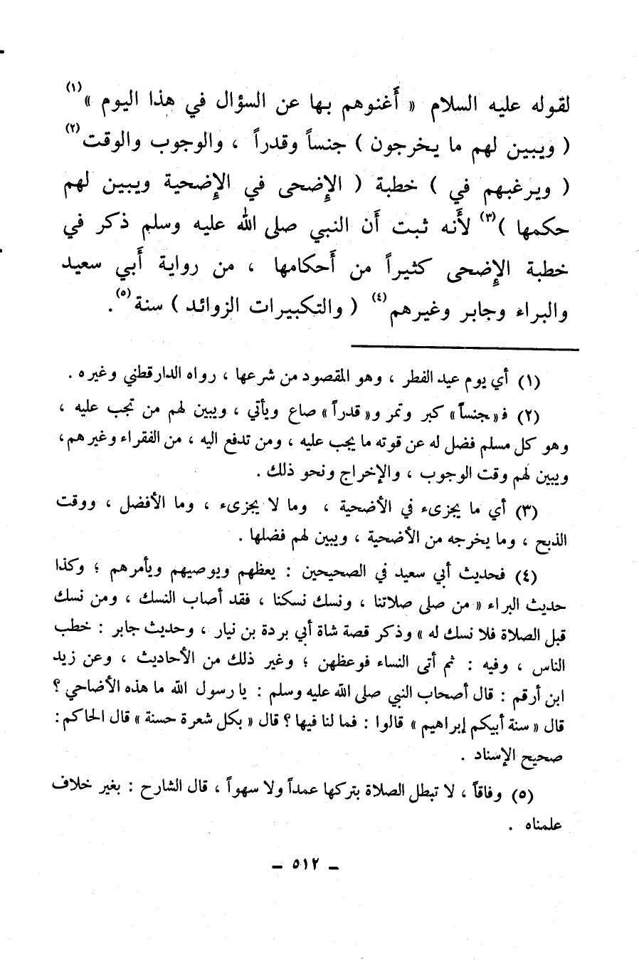 (¬4) فحديث أبي سعيد في الصحيحين: يعظهم ويوصيهم ويأمرهم وكذا حديث البراء «من صلى صلاتنا ونسك نسكنا، فقد أصاب النسك، ومن نسك قبل الصلاة فلا نسك له» ، وذكر قصة شاة أبي بردة بن نيار، وحديث جابر: خطب الناس وفيه: ثم أتى النساء فوعظهن، وغير ذلك من الأحاديث وعن زيد بن أرقم: قال أصحاب النبي صلى الله عليه وسلم يا رسول الله ما هذه الأضاحي؟ قال: «سنة أبيكم إبراهيم» قالوا: فما لنا فيها؟ قال: «بكل شعرة حسنة» ، قال الحاكم: صحيح الإسناد.