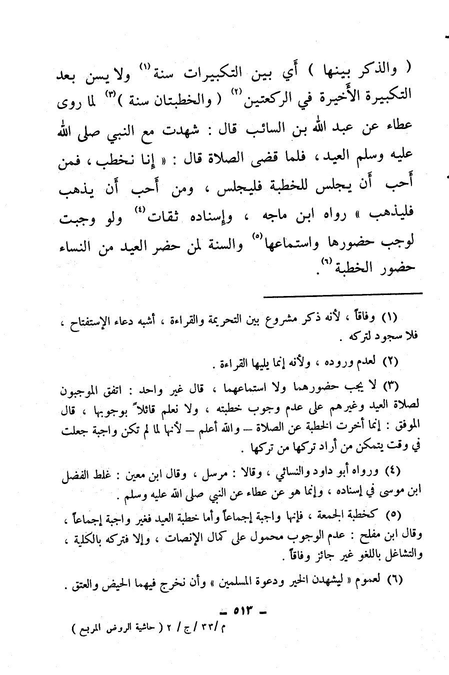 (والذكر بينها) أي بين التكبيرات سنة (¬1) ولا يسن بعد التكبيرة الأخيرة في الركعتين (¬2) (والخطبتان سنة) (¬3) لما روى عطاء عن عبد الله بن السائب قال: شهدت مع النبي صلى الله عليه وسلم العيد، فلما قضى الصلاة، قال: «إنا نخطب، فمن أحب أن يجلس للخطبة فليجلس ومن أحب أن يذهب فليذهب» رواه ابن ماجه، وإسناده ثقات (¬4) ولو وجبت لوجب حضورها واستماعها (¬5) والسنة لمن حضر العيد من النساء حضور الخطبة (¬6) .