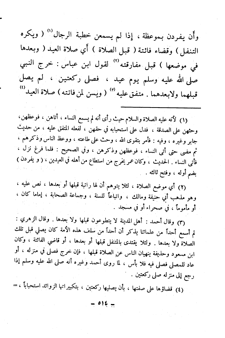 وأن يفردن بموعظة، إذا لم يسمعن خطبة الرجال (¬1) (ويكره التنفل) وقضاء فائتة (قبل الصلاة) أي صلاة العيد (وبعدها في موضعها) قبل مفارقته (¬2) لقول ابن عباس: خرج النبي صلى الله عليه وسلم يوم عيد، فصلى ركعتين، لم يصل قبلهما ولا بعدهما، متفق عليه (¬3) (ويسن لمن فاتته) صلاة العيد (¬4) .
