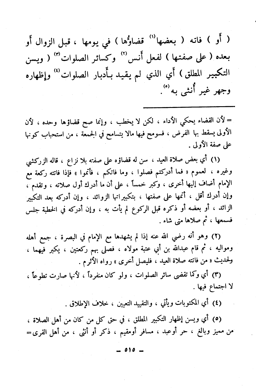 (أو) فاته (بعضها (¬1) قضاؤها) في يومها، قبل الزوال، أو بعده (على صفتها) لفعل أنس (¬2) وكسائر الصلوات (¬3) (ويسن التكبير المطلق) أي الذي لم يقيد بأدبار الصلوات (¬4) وإظهاره وجهر غير أنثى به (¬5) .