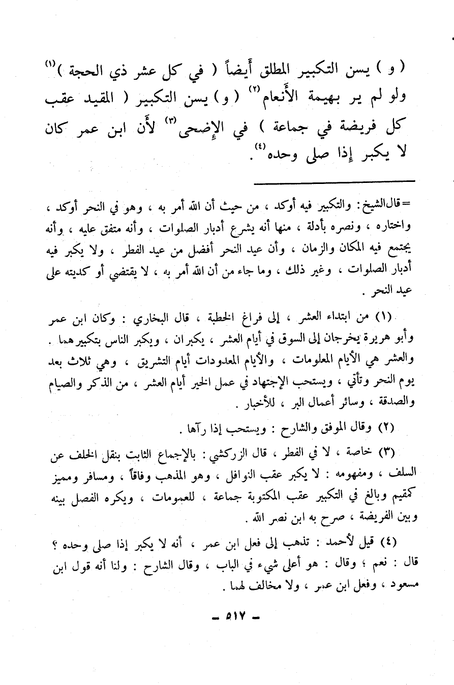 (¬3) خاصة، لا في الفطر، قال الزركشي، بالإجماع الثابت بنقل الخلف عن السلف، ومفهومه لا يكبر عقب النوافل، وهو المذهب وفاقا، ومسافر ومميز كمقيم وبالغ في التكبير، عقب المكتوبة جماعة، للعمومات ويكره الفصل بينه وبين الفريضة، صرح به ابن نصر الله.