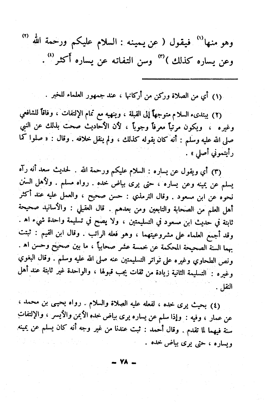 (¬4) بحيث يرى خده، لفعله عليه الصلاة والسلام، رواه يحيى بن محمد، عن عمار، وفيه وإذا سلم عن يساره يرى بياض خده الأيمن والأيسر، والالتفات سنة فيهما لما تقدم، وقال أحمد: ثبت عندنا من غير وجه أنه كان يسلم عن يمينه ويساره، حتى يرى بياض خده.
