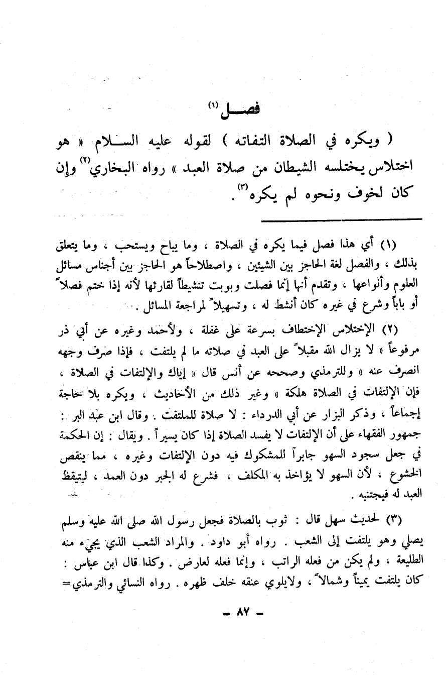 (¬2) الاختلاس الاختطاف بسرعة على غفلة، ولأحمد وغيره عن أبي ذر مرفوعا «لا يزال الله مقبلا على العبد في صلاته ما لم يلتفت فإذا صرف وجهه انصرف عنه» وللترمذي وصححه عن أنس قال: إياك والالتفات في الصلاة، فإن الالتفات في الصلاة هلكة، وغير ذلك من الأحاديث، ويكره بلا حاجة إجماعا، وذكر البزار عن أبي الدرداء، لا صلاة للملتفت وقال ابن عبد البر: جمهور الفقهاء على أن الالتفات لا يفسد الصلاة إذا كان يسيرا، ويقال: إن الحكمة في جعل سجود السهو جابرا للمشكوك فيه دون الالتفات وغيره، مما ينقص الخشوع لأن السهو لا يؤاخذ به المكلف، فشرع له الجبر دون العمد، ليتيقظ العبد له فيجتنبه.