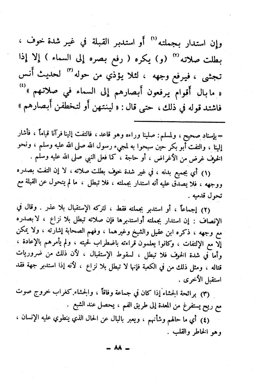 وإن استدار بجملته (¬1) أو استدبر القبلة في غير شدة خوف، بطلت صلاته (¬2) (و) يكره (رفع بصره إلى السماء) إلا إذا تجشى فيرفع وجهه، لئلا يؤذي من حوله (¬3) لحديث أنس ما بال أقوام يرفعون أبصارهم إلى السماء في صلاتهم (¬4) ، فاشتد قوله في ذلك، حتى قال: لينتهين أو لتخطفن أبصارهم.