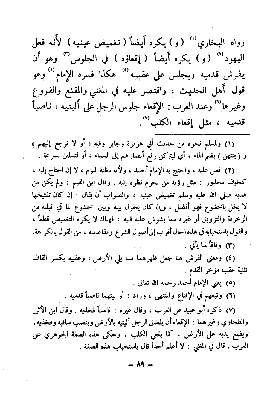 رواه البخاري (¬1) (و) يكره أيضا (تغميض عينيه) لأنه فعل اليهود (¬2) (و) يكره أيضا (إقعاؤه) في الجلوس (¬3) وهو أن يفرش قدميه ويجلس على عقبيه (¬4) هكذا فسره الإمام (¬5) وهو قول أهل الحديث، واقتصر عليه في المغني والمقنع والفروع وغيرها (¬6) وعند العرب: الإقعاء جلوس الرجل على أليتيه، ناصبا قدميه، مثل إقعاء الكلب (¬7) .
