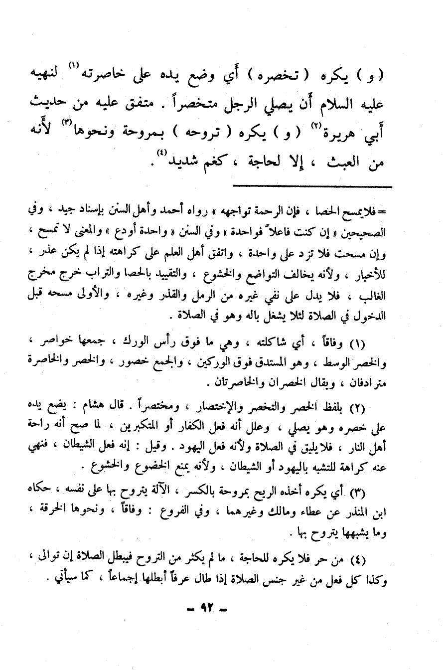 (و) يكره (تخصره) أو وضع يده على خاصرته (¬1) لنهيه عليه السلام أن يصلي الرجل متخصرا، متفق عليه من حديث أبي هريرة (¬2) (و) يكره (تروحه) بمروحة ونحوها (¬3) لأنه من العبث، إلا لحاجة، كغم شديد (¬4) .