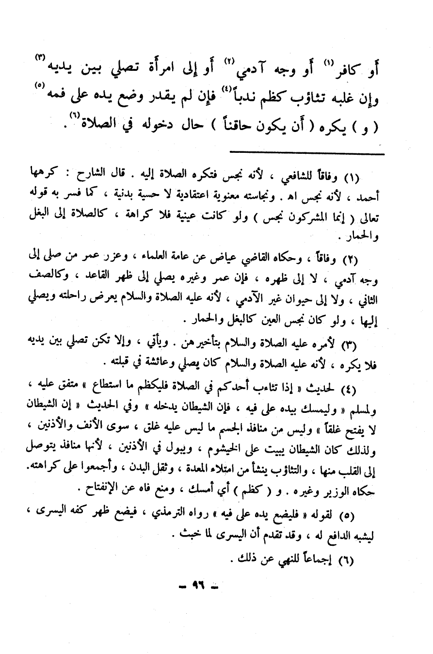 أو كافر (¬1) أو وجه آدمي (¬2) أو إلى امرأة تصلي بين يديه (¬3) وإن غلبه تثاؤب كظم ندبًا (¬4) فإن لم يقدر وضع يده على فمه (¬5) (و) يكره (أن يكون حاقنًا) حال دخوله في الصلاة (¬6) .