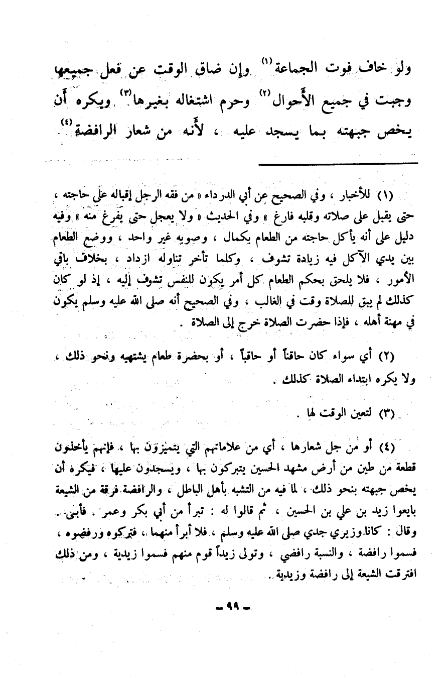 (¬4) أو من جُل شعارها، أي: من علاماتهم التي يتميزون بها، فإنهم يأخذون قطعة من طين من أرض مشهد الحسين يتبركون بها، ويسجدون عليها، فيكره أن يخص جبهته بنحو ذلك، لما فيه من التشبه بأهل الباطل، والرافضة فرقة من الشيعة بايعوا زيد بن علي بن الحسين، ثم قالوا له: تبرأ من أبي بكر وعمر، فأبي وقال: كانا ويري جدي صلى الله عليه وسلم فلا أبرأ منهما، فتركوه ورفضوه، فسموا رافضة، والنسبة رافضي، وتولى زيدا قوم منهم فسموا زيدية، ومن ذلك افترقت الشيعة إلى رافضة وزيدية.