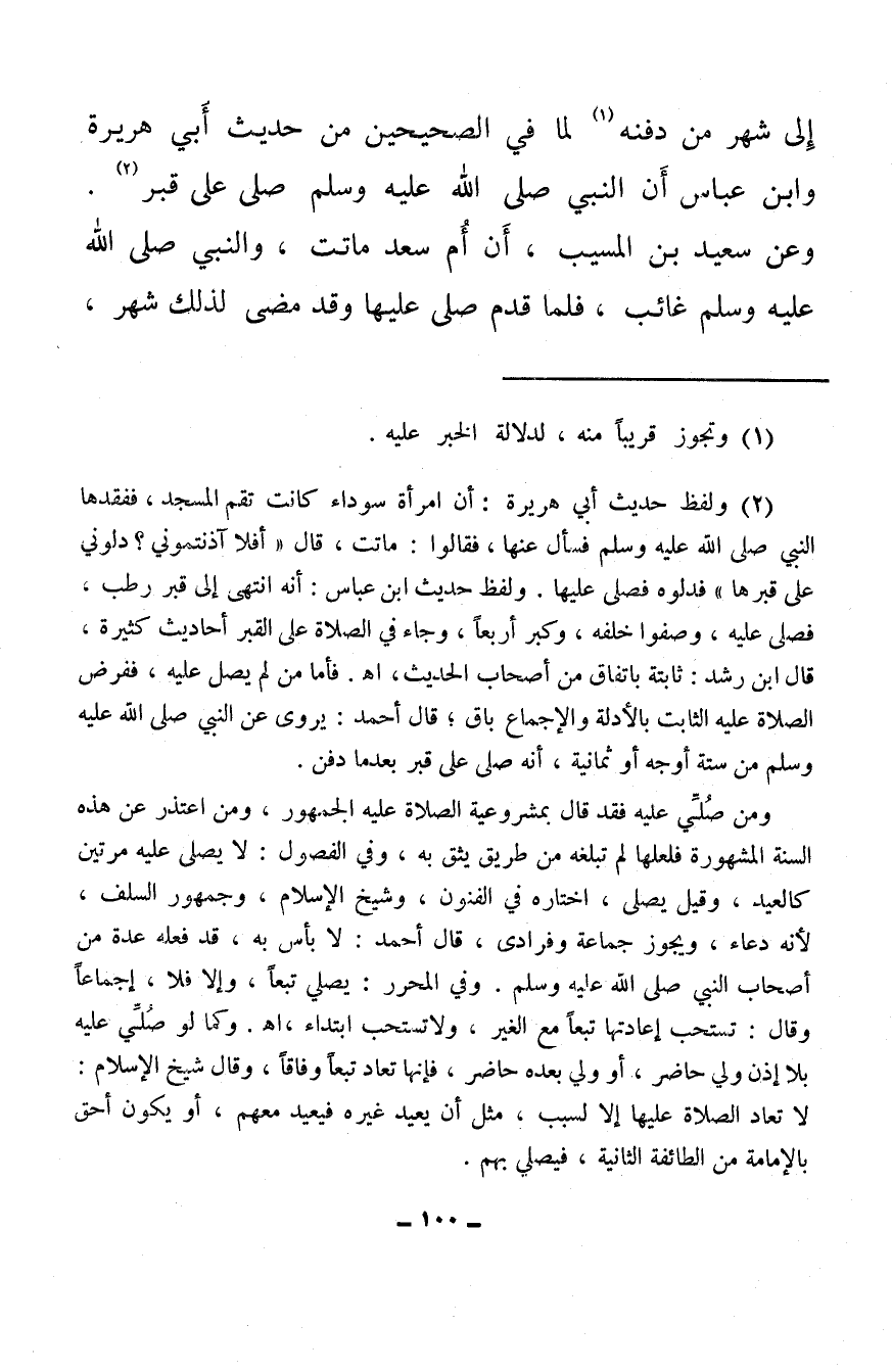 (¬2) ولفظ حديث أبي هريرة: أن امرأة سوداء كانت تقم المسجد، ففقدها النبي صلى الله عليه وسلم فسأل عنها، فقالوا: ماتت، قال «أفلا آذنتموني؟ دلوني على قبرها» فدلوه فصلى عليها. ولفظ حديث ابن عباس: أنه انتهى إلى قبر رطب، فصلى عليه، وصفوا خلفه، وكبر أربعًا، وجاء في الصلاة على القبر أحاديث كثيرة.