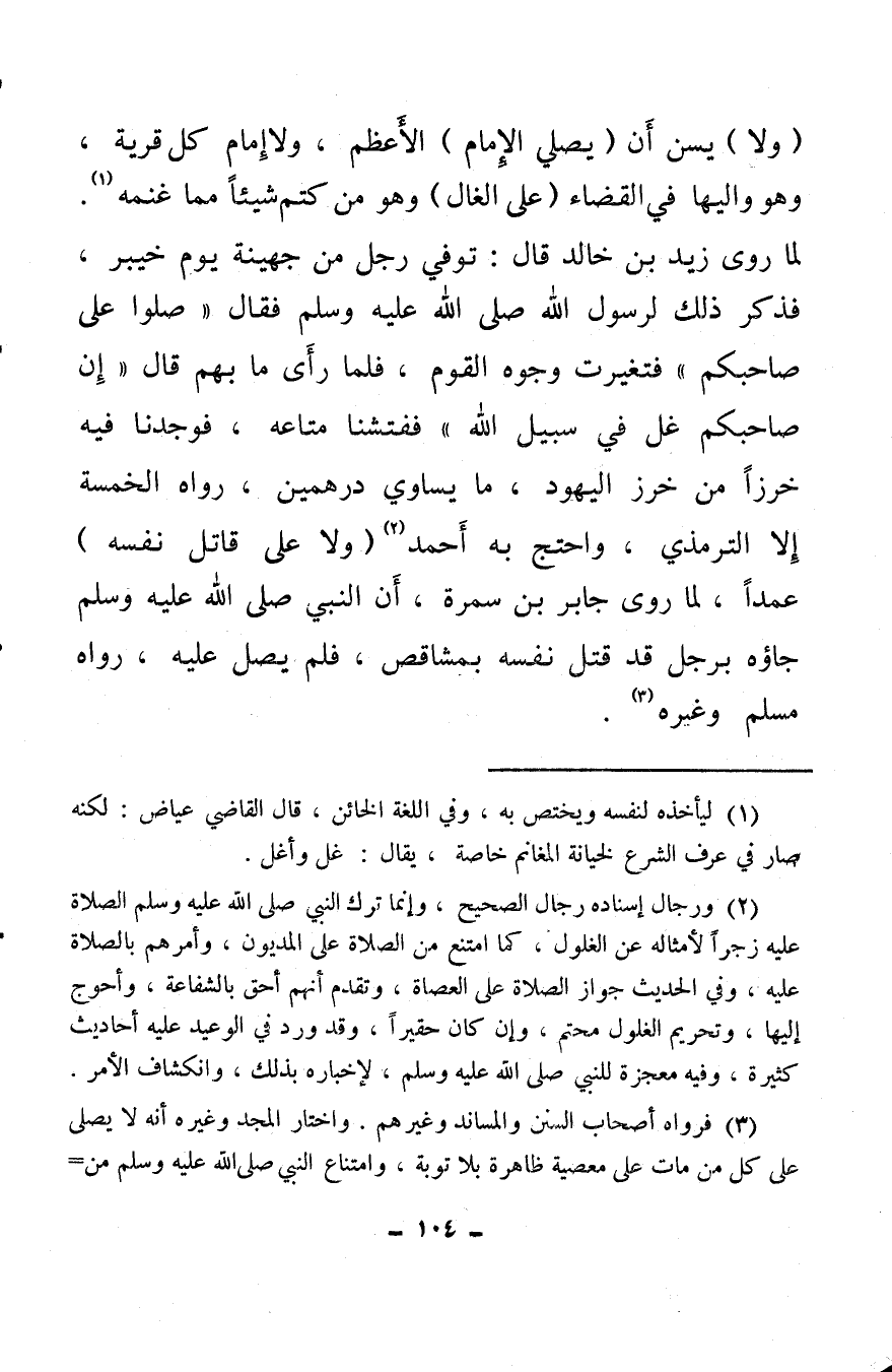 (ولا) يسن أن (يصلي الإمام) الأَعظم، ولا إمام كل قرية، وهو واليها في القضاء (على الغال) وهو من كتم شيئًا مما غنمه (¬1) . لما روى زيد بن خالد قال: توفي رجل من جهينة يوم خيبر، فذكر ذلك لرسول الله - صلى الله عليه وسلم - فقال «صلوا على صاحبكم» فتغيرت وجوه القوم، فلما رأَى ما بهم قال «إن صاحبكم غل في سبيل الله» ففتشنا متاعه، فوجدنا فيه خرزًا من خرز اليهود، ما يساوي درهمين، رواه الخمسة إلا الترمذي، واحتج به أحمد (¬2) (ولا على قاتل نفسه) عمدًا، لما روى جابر بن سمرة، أن النبي - صلى الله عليه وسلم - جاؤه برجل قد قتل نفسه بمشاقص، فلم يصل عليه، رواه مسلم وغيره (¬3) .